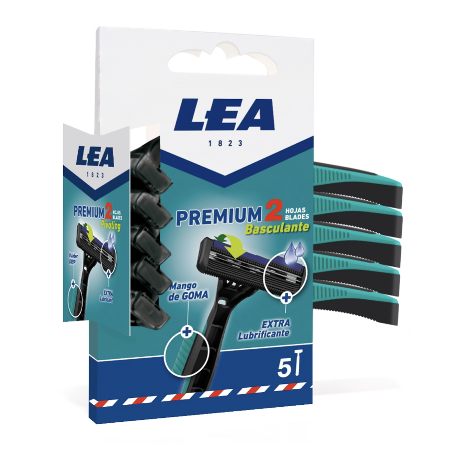 Maquinilla de dos hojas de acero inoxidable y con banda lubrificada para un mejor deslizado de la cuchilla. Hojas con geometría abierta para una fácil limpieza y aclarado. Mango ergonómico de goma y cabezal basculante para un afeitado más preciso y apurado.